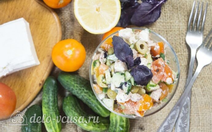 Овощной салат с тунцом – это прекрасный вариант разнообразить свое летнее меню. Да и не только летнее, ведь тунец может стать прекрасным дополнение к салатам и в зимнее время. Вкусно и полезно Данный салат хорош тем, что в его составе свежие овощи, оливки, тунец, масло и сыр, а этот набор продуктов уже является кладезем витаминов. Такой салат можно даже подавать сам по себе, без гарнира или какого-либо дополнения. Потому что салаты с тунцом обычно не только вкусные, и но сытные. Они насыщают на долгое время и к тому же являются диетическими. Абсолютно все блюда с тунцом считаются высокобелковыми. Ингредиенты: Оливки - 100 г Сыр фета - 100 г Помидоры - 3 шт. Огурцы - 2 шт. Тунец в собственном соку - 80 г Зеленый лук - 2 веточки Базилик - 1 веточка Сок лимона - 1 ст. л. Оливковое масло - 2 ст. л. Черный перец молотый - 0,3 ч.л. Приготовление: 1. Для заправки сок лимона соединить с оливковым маслом и молотым перцем. 2. Тунец размять вилкой. 3. Сыр нарезать кубиками и отправить к тунцу