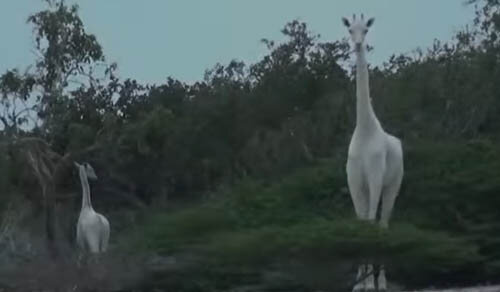 Рейнджеры, работающие в одном из заповедников Кении, давно уже слышали слухи о том, что обитающая там белая самка жирафа стала матерью. И вот наконец людям представилась возможность воочию увидеть и гордую мамашу, и её прекрасного детёныша, унаследовавшего от родительницы крайне редкий окрас. Жирафы были очень спокойно настроены по отношению к рейнджерам и, кажется, совершенно не стеснялись их присутствия, а те, в свою очередь, глазам своим не могли поверить, наблюдая столь красивое зрелище.