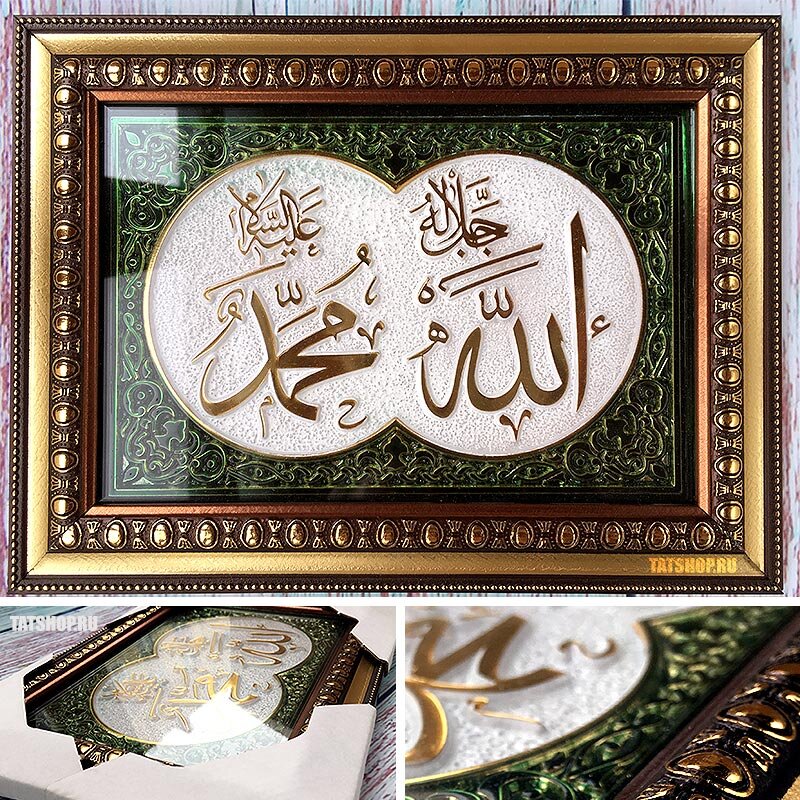 Небольшой шамаиль, с надписями на арабском языке «Аллах» и «Мохаммад (мир ему!)» Качественное, рельефное панно, сделанное «под гипс», с тиснением золотой и благородной зеленой краской.