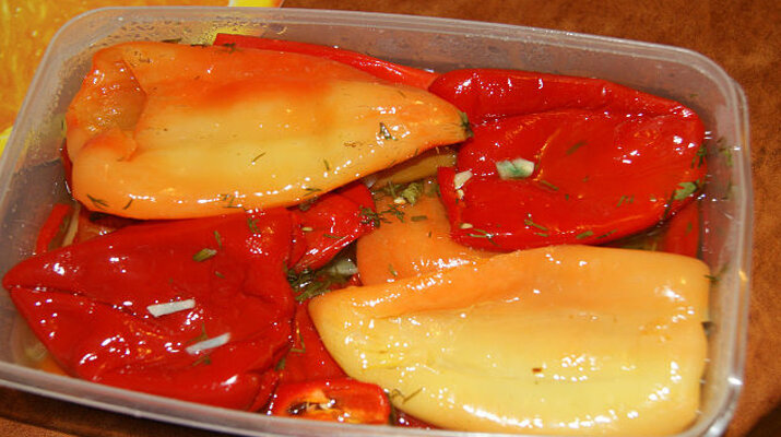 Перец маринованный быстрого приготовления — закуска на все времена и случаи. Ароматный острый перец уже будет на вашем столе через пару часов. Мы обычно, когда куда то собираемся, я с вечера перец этот делаю, а на утро уже готов тазик вкусного маринованного перца. Все, что вам потребуется: Перец болгарский — 1 кг.; подсолнечное масло — 200 мл.; сахар — 1 ч.л.; уксус — 100 мл.; соль — 1 столовая ложка без горки; лавровый лист — 2-3 штуки; перец горошком — 5-6 шт.; чеснок — 5-6 зубков; можно по желанию добавить укропа. Перец маринованный быстрого приготовления. Пошаговый рецепт У перца удалите плодоножку и семена. В кастрюлю налить подсолнечное масло, добавить уксус, лавровый лист, перец горошком и лавровый лист, соль и сахар. По очереди выкладывать перец на дно кастрюли, немного его прижимая. Пусть проварится в маринаде 1-2 минуты. Выкладывайте перец в емкость, и так проделайте со всем перцем. Пересыпьте перец чесноком и по желанию можно зеленью. Вылейте на перец оста