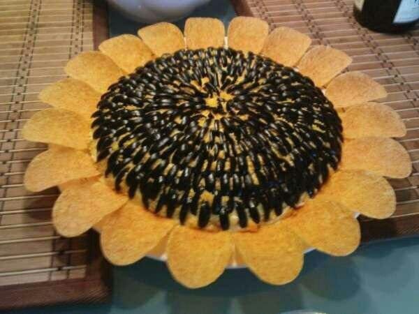 Ингредиенты: — куриная грудка 300 г — шампиньоны 300 г — яйца 7 шт. — сыр 150 г — маслины без косточек 1/2 банки — чипсы Pringles 1 банка — майонез 1 шт. Приготовление: 1. Смешиваем кусочки куриной грудки с майонезом — это будет первый слой нашего салата. 2. Затем выкладываем грибочки и лук, заправляем майонезом. 3. Следующий слой салата выкладываем из натёртых на крупной тёрке варёных яиц. 4. Снова смазываем слой майонезом. 5. Четвертый слой — тёртый на мелкой тёрке сыр. 6. Далее красиво размещаем маслины на верхушке салата. 7. До подачи поместите салат в холодильник. 8. Перед подачей к столу украсьте салат чипсами как показано на картинке, чтобы получился подсолнух. Приятного аппетита! :) Если вам понравился рецепт, ставьте 👍 и подписывайтесь на канал.