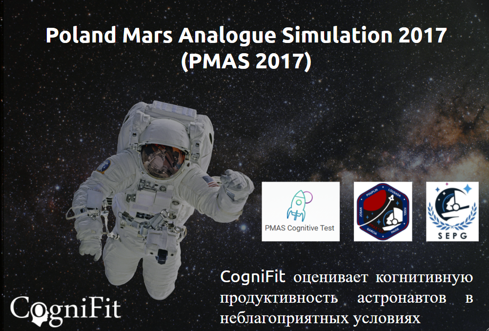 CogniFit (“КогниФит”) участвует в “космической миссии” на Марс, исследуя когнитивную продуктивность астронавтов в условиях воздействия неблагоприятных космических факторов. CogniFit (“КогниФит”), программа-лидер в области когнитивного тестирования, когнитивной стимуляции и тренировки мозга, участвует в международной космической миссии по симуляции жизни на Марсе Poland Mars Analogue Simulation 2017 (PMAS 2017), тестируя когнитивные способности команды участников эксперимента в неблагоприятных условиях жизни на Луне или Марсе. Технологические инновации CogniFit (“КогниФит”) способствуют подготовке полёта человека на “красную планету”. Решающее значение для успеха миссии на Марс имеют исследования и ответы на вопросы как люди могут существовать в соответствующих условиях этой планеты. “Консультативный совет космического поколения” (Space Generation Advisory Council) при поддержке различных организаций (в том числе ООН) отправил 6 астронавтов для участия в миссии по симуляции жизни в ус