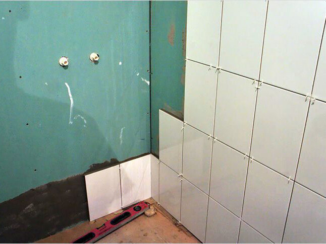 Обычно плитка укладывается на заранее выровненную шпаклевкой стену. Но порой такое выравнивание не рационально, и стену легче закрыть гипсокартоном. Выполнить облицовку помещения плиткой поверх гипсокартона несложно, но нужно знать основные нюансы подобной работы. После того как стена будет закрыта гипсокартоном, «новая» поверхность по стыкам выравнивается шпаклёвкой и после высыхания покрывается грунтовкой, иначе обеспечить хорошую сцепку плитки с гипсокартоном не получится. Как только стена будет полностью готова можно приступить к подготовительным работам с плиткой: 1. Плитка распаковывается и на полу выкладывается рисунок, который в итоге должен быть перенесён на стену. Плитки друг к другу плотно не прикладываются, так как между каждой из них должны быть зазоры – зафиксировать такие зазоры можно с помощью специальных пластмассовых крестиков. 2. Даже если плитка монотонного цвета, предварительную раскладку на полу все равно требуется выполнить. Необходимо просмотрет