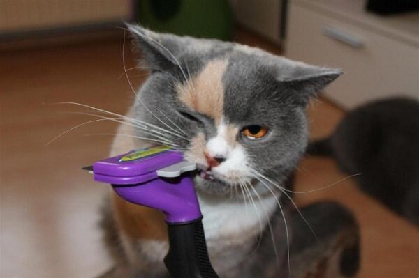 Фурминатор – это инструмент для удаления отмерших волосинок, прежде всего из подшерстка. Устройство состоит из рукоятки и рабочего лезвия со множеством мелких изогнутых зубцов. Специфическая форма последних позволяет подцеплять и вытягивать волоски из подшерстка. Внешне фурминатор напоминает увеличенный в размере станок безопасной бритвы. Основное преимущество фурминатора заключается в том, что он не повреждает остевые волосы, но при этом очень эффективно удаляет пух и волосинки подшерстка. Благодаря регулярному применению инструмента можно примерно в десять раз сократить количество выпадающей шерсти. Устройство убирает только уже отмершие волосинки, не трогая «живого» меха. Фурминатор является отличным профилактическим средством против колтунов, его регулярное использование практически исключает появление этих сваленных пучков шерсти. Обращаться с этим инструментом очень просто, это не требует специальных навыков. Немаловажно то, что используя фурминатор, практически невозможно ранит