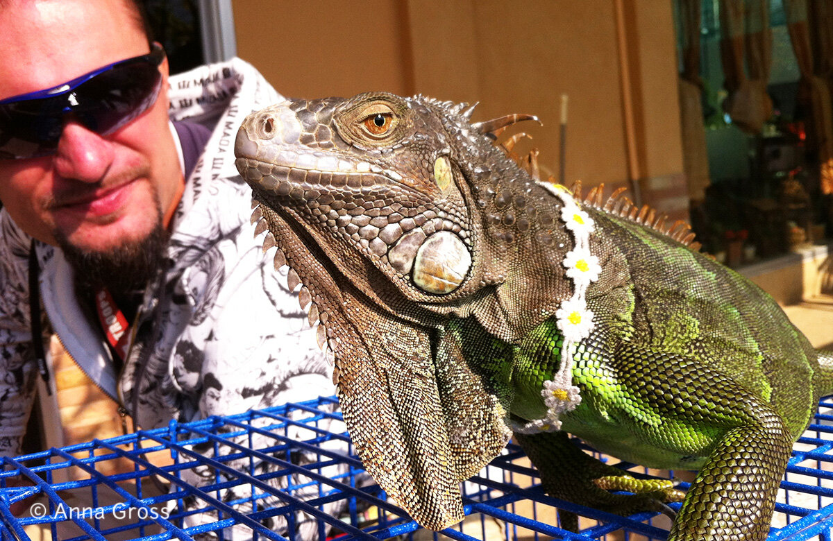 — Она такая милая, спит со мной в одной кровати! — говорит тайка, продающая билеты и экскурсии. Как и полагается, её офис это и дом одновременно. Игуана по имени Красавица (Суай Суай) не кусается и ходит сама по себе. Прямо как домашняя кошка. Её окружают более характерные соседи, тоже игуаны: во дворе стоит клетка с огромным самцом, полтора метра длиной. Он бесится и кидается с одной стороны клетки на другую. Знакомые отдали. Конечно, не получилось чесать за ушком под довольное урчание, они и сбагрили зверя добрым людям. В другой клетке поменьше сидит зелёный игуанчик. Мальчик. Купили на рынке. Уж очень нравятся хозяевам эти рептилии. Красавица неподражаема. Позирует как модель, на шее у неё ожерелье из ромашек, томный взгляд. А какие пальцы... тонкие пальцы дивы. Разве что зелёные и чешуйчатые. Её можно безбоязненно держать на руках даже чужим людям. Вот такой покладистый и дружелюбный характер. А может, женская мудрость, благодяря которой Суай Суай (дословный перевод: красивая пр