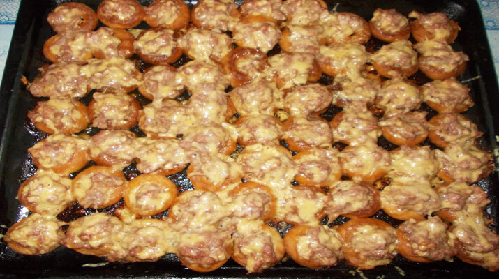 Пицца из бубликов — пробовали такую? Это чудо маленькие пиццы, как семечки. Скушать их можно о-о-о-очень много, главное во время остановится)). А если серьезно такая закуска — просто бесподобная, и понравится и мужчинам и женщинам, и детвора ее будет уплетать за обе щеки. Маленькие сладенькие бублики с фаршем и сыром — ну ведь вкусно! Ингредиенты: Бублики (маленькие) — 500 грамм; фарш — 400 грамм; сыр — 200 грамм; молоко — 2 стакана; соль/перец по вкусу (вместо соли можно использовать соевый соус, получается ароматно очень); лук — 1 штука. Пицца из бубликов. Пошаговый рецепт Бублики залейте достаточно теплым молоком. Помешивайте их, чтобы они размокли немного. К фаршу добавьте натертую на терке луковицу (можно и чесночок), и половину сыра. Посолите, поперчите по вкусу. Противень смажьте маслом, и выкладывайте бублики, которые размягчились в молоке. В серединку получившийся фарш, а сверху натертым на мелкую терку сыр. И в духовку отправляем на 20-25 минут. Все, вот и
