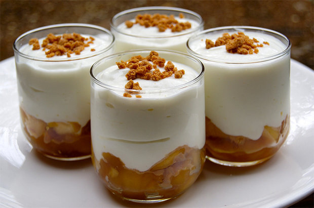 - На дно стаканчиков выложить яблоки, а сверху мягкий творог. Посыпать измельченным печеньем.