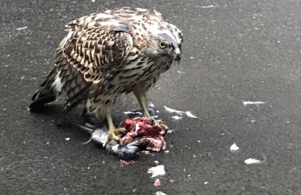 Ястреба заметили на Светлановском проспекте вечером. В одном из дворов, не обращая внимания на людей, птица клевала растерзанную тушку голубя посреди проезжей части. Автомобилисты не могли проехать из-за этого события. Ужинал ястреб у дома 60 примерно полчаса. Хищник на время улетел в кусты, лишь когда его спугнула собака. Мы будем следить за развитием событий. Некоторые очевидцы вспоминают, что ястребы садились к ним даже на балкон. Кто-то вспомнил, как ястреб прилетал во дворы на улице Черкасова в Калининском районе.