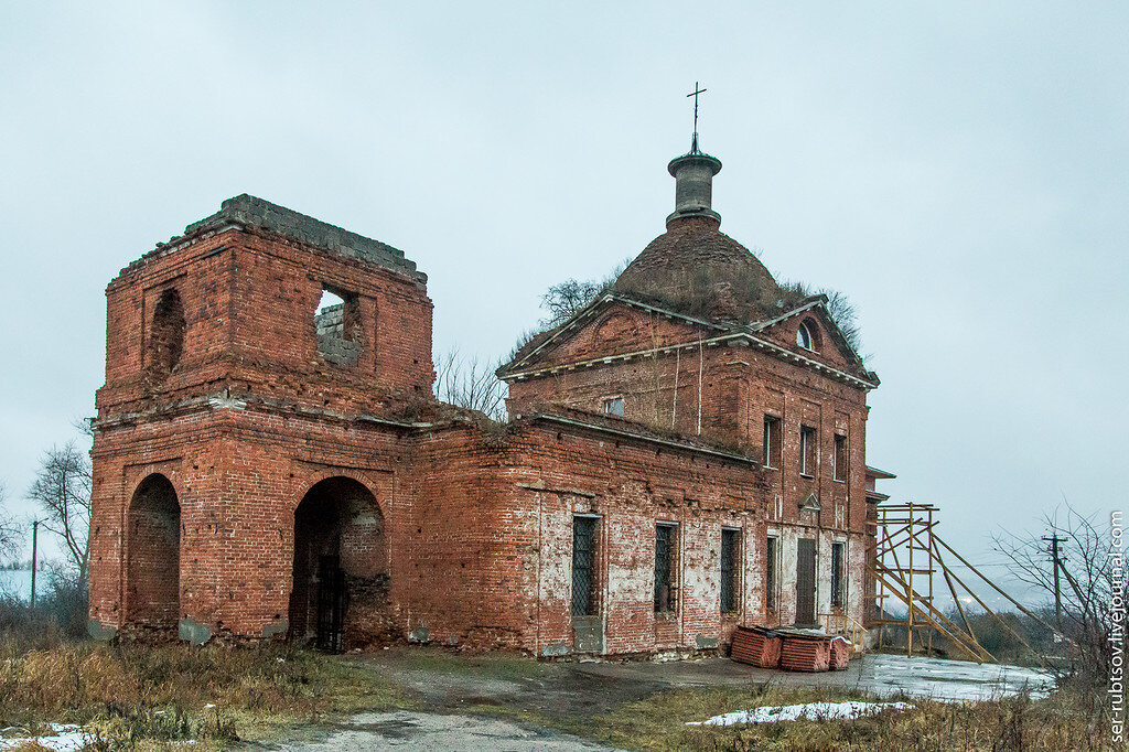 Село Осиновая Гора расположено в городском округе Тулы, совсем недавно, относившемся к Ленинскому району области. Это одно из тех мест, когда проезжая мимо и видя вывеску 1,5 км, думаешь, что попасть туда можно в любой момент и, как всегда, немного с этим затягиваешь. В Осиновой Горе меня интересовала Церковь Казанской иконы Божией Матери: Кирпичная церковь была построена тут в начале 19-го века помещиком секунд-майором Хрущевым Д.А., вместо существовавшей тут деревянной. Основной объем представлял собой двусветный четверик, перекрытый высоким купольным сводом: Также при церкви была колокольня, которая после закрытия храма во времена СССР лишилась верхней части: Храм оказался закрыт, т.к. в нем велись восстановительные работы, а на часах уже был вечер. Вокруг лежат строительные материалы, установлены пластиковые окна, стоят леса и поставлена новая железная дверь: При этом все это сделано в основной части храма, в трапезной все такие же решетки без стекол, а в своде виднеется дыра: Кое