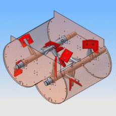 Эти два типа бетоносмесителей отличаются друг от друга по принципу размешивания. У бетоносмесителя с вертикальным расположением вала три лопатки вращаются вокруг вертикальной оси внутри рабочей емкости, а у бетоносмесителя с горизонтальным расположением вала ось вращения лопаток — горизонтальная. У двухвального бетоносмесителя, соответственно, на двух горизонтальных валах закреплены десять лопаток. Специфика их работы заключается в том, что они вращаются навстречу друг другу. Это обеспечивает прорезание перемешиваемой смеси с одновременным ее хаотическим подбрасыванием. Скорость размешивания и однородность смеси от этого существенно улучшается, так как лопатки перемешивают смесь по замкнутому цилиндру и за счет турбулентных завихрений не оставляют непромешенных слоев приготовляемой смеси. Приведем некоторые технические характеристики этих двух типов смесителей одинакового объема по загрузке 375 литров. Три смесительные лопатки бетоносителя типа 1В с вертикальным валом вращаются скор