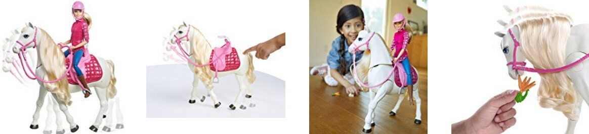 Первая лошадка Барби, которая настолько реальна! Интерактивная лошадка мечты Барби. Реальнее, чем раньше! Получаем опыт верховой езды вместе с куклой Барби и её лошадкой DreamHorse, самой интересной на сегодня интерактивной лошадкой для куклы из когда-либо созданных! Красивая белая лошадь реагирует на действия и прикосновения, выдавая более 30-ти реалистичных реакций, которые приносят красоту лошадей к жизни! Игрушка подарит вам самые разнообразные интерактивные ответы на сенсорные и звуковые стимулы. DreamHorse может идти вперёд, поворачивать на 360 градусов, моргать и ржать, когда вы с ней играете. Её можно кормить морковкой, которая идёт в наборе, и наблюдать за реакцией питомца. DreamHorse даже кивает в ответ на ваш вопрос, словно отвечая "да" или "нет". Это настоящая игрушка мечты для всех любителей лошадей! Различные режимы позволяют играть в разные игры, в которых Барби DreamHorse реагирует на прикосновение и звуки. Включайте воображение, потому что с Барби возможно