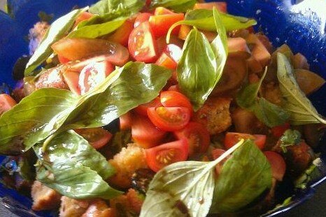 7. Чиабатта - 1 штука Инструкция приготовления 1. Разноцветные помидоры (желтые, черные, традиционно красные и, что неожиданно — зеленые, незрелые, размером с черри) берем не крупные (всего 0,5 кг) и нарезаем их в емкость для салата (не металлическую). Нарезка может быть разной формы — дольками, кружочками и, кому как нравится. 2. Немного солим и перчим (я брал белый молотый перец, он ароматнее). 3. Грубо рубим (без стеблей) листья зеленого базилика и кинзы (опять же — количество по вкусу и не бойтесь положить больше, не испортите). 4. Выжмем прессом один зубчик чеснока. 5. Влейте 4 столовые ложки оливкового масла и 2–3 ложки красного винного уксуса. 6. Натрите на терке цедру одного лайма (старайтесь натирать без белого слоя), затем ладошкой покатайте лайм по столу и ото