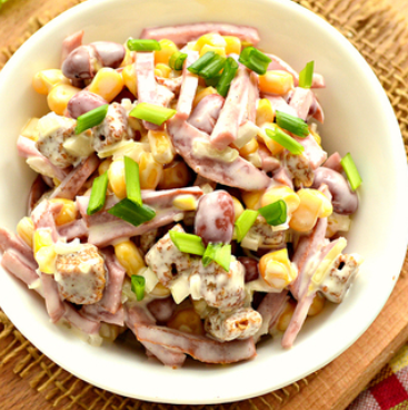 Нарезаем соломкой колбасу, добавляем кукурузу, фасоль, соль и черный молотый перец. Луковицу нарежем полукольцами и зальем на минуту кипятком, сольем воду и добавим к остальным ингредиентам вместе с майонезом и сухариками. Перемешиваем, посыпаем нарезанным зеленым лучком. Приятного аппетита!
