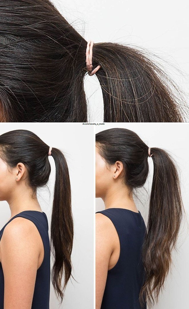 Для того, чтобы сделать объемный хвост достаточно лишь правильно закрепить его резинкой. А именно: делайте хвост как обычно, но на последнем обороте резинкой, подтяните только нижнюю половину хвоста (как на фото 1). Этот трюк поможет подтянуть нижнюю часть волос и немного приподнять верхнюю. 2. Создаем прикорневой объем