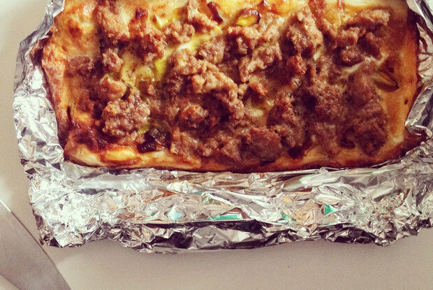 7. Свиной фарш - 200 г Инструкция приготовления 1. Тесто раскатываем, укладываем на фольгу, обмазываем соусом. 2. Лук-порей (примерно 1/3 стебля) тонко нарезаем. Обжариваем на сливочном масле 2–3 минуты. Выкладываем лук на тесто. 3. Свинину перемалываем в фарш, обжариваем на оливковом масле 3–4 минуты, выкладываем на тесто. 4. Яйцо взбиваем с солью и перцем. Заливаем пирог. 5. Выпекаем в аэрогриле при температуре 200 градусов 20 минут на средней решетке.