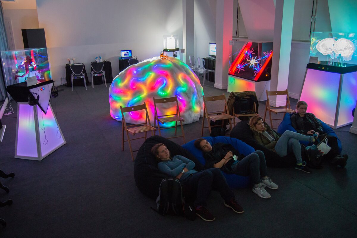 В интеллектуальном кластере «Игры разума» проходит интерактивная выставка «Мозг: Вселенная внутри нас». Корреспондент «Мегабайт» Елена Герасимова увидела, как клетки и нервные импульсы формируют человеческое сознание. Маленькая площадь, которую занимает выставка, сначала настораживает, но затем опасения исчезают: информация сконцентрирована настолько плотно, понятно и интересно, что на изучение экспозиции уходит не менее полутора часов. Выставка условно разделена на три части. Первая — кинозона, где показывают научно-популярный фильм про мозг. Во второй я испытываю на себе американские и японские нейроинтерфейсы. А третья включает экспонаты, собственноручно собранные создателями выставки. Здесь можно увидеть человека Пенфилда, разрез нейрона и нервные глии, прозрачный мозг и многое другое. Возле каждого экспоната — наушники, надеваю их и слушаю удивительные факты о мозге и нейронах. еловек Пенфилда Человек Пенфилда Мозг осознает наше тело далеко не таким, каким мы видим его в зеркале.