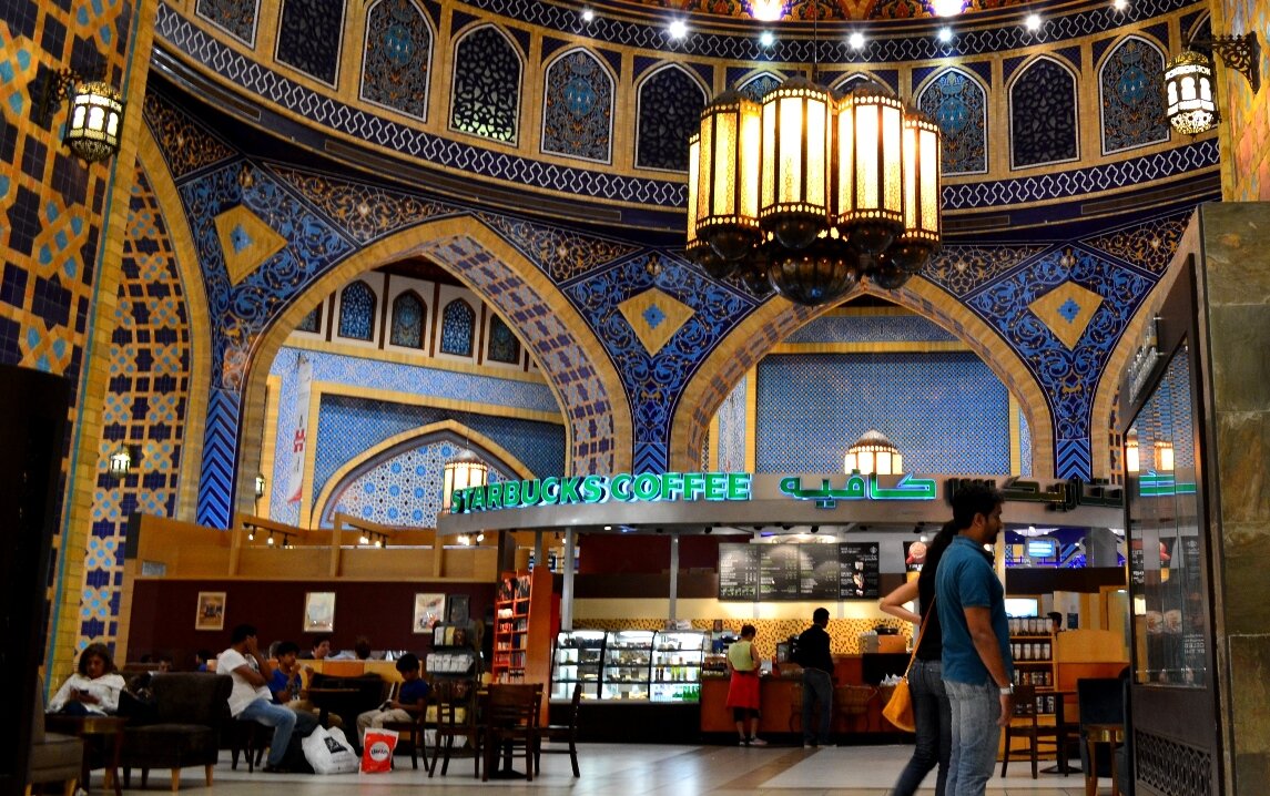Первый кафетерий Starbucks на Ближнем Востоке открылся в 1991 году, в Кувейте, сегодня сеть кафе насчитывает более 22,5 тыс. заведений в 66 странах мира. В Дубае он является излюбленным местом отдыха как местных жителей, так и туристов. Вы найдёте Starbucks и в дубайском молле, и в знаменитом Ибн баттута молле на территории Персидского квартала, недалеко от шоссе Шейха Заеда. Столики ресторана установлены в просторном зале, который освещают огромные люстры в персидском стиле. Резные арки, выложенные цветной мозаикой стены, обилие украшений из дерева и стильная дизайнерская мебель позволили сделать кафетерий Starbucks одним из самых нарядных и посещаемых гастрономических заведений в городе.