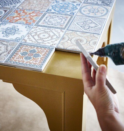 Отличнейшая идея, сочетающая в себя красоту и практичность. Все, что вам нужно, это приобрести типовой журнальный стоик в магазине ИКЕА или любом другом и керамическую плитку на свой вкус и цвет. К слову, этнический орнамент весьма хорош. Крепление плитки к столику, как видно на рисунке, происходит за счет пистолета с горячим клеем. Однако, вы можете использовать другой, доступный для вас вариант.
