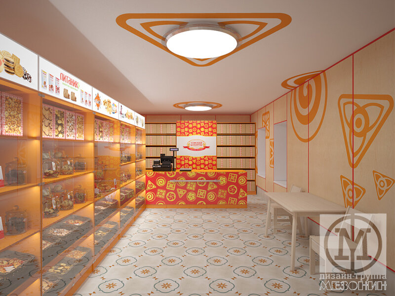 Небольшой фирменный магазин "Томский кондитер" находится рядом с производственными цехами. Здесь будет продаваться большой ассортимент печенья. Практически все стены за витринами заставлены стеллажами для готовой продукции и подтоварки. Своего рода магазин-склад. Такой лёгкий, беззаботный интерьер. Стены выполнены из облагороженного ГВЛ по металлическому профилю (сухой способ монтажа). Приложено также фото реализованного проекта. Немного жаль, что поменяли напольную плитку и цвет декора на потолке. Наш сайт: mezonin.tomsk.ru