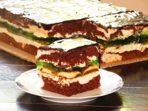 http://domkuhnya.com/wp-content/uploads/2017/10/a646152e48cc649e49c83bb97a3aa44a.jpg Изумительной красоты торт станет центром Вашего праздничного стола. Его приготовление потребует немало времени, но результат того стоит. «Глаза Клеопатры», или «Глаза царицы» — еще один безумно вкусный десерт. Названный в честь легендарной правительницы, готовый торт и правда получается очень красивым. Благодаря прослойке из желе торт в разрезе напоминает зеленые глаза. Продукты: Для светлого теста: Яичные белки — 6 шт. Сахар — 1,5 стакана. Крахмал — 1 стакан. Уксус — 1 ст. ложка Растительное масло — 50 мл. Для темного теста: Яичные желтки — 6 шт. Яйца — 2 шт. Сахар — 6 ст. ложек Мука — 4 ст. ложки Разрыхлитель — 1 ч. ложка Какао — 2 ст. ложки Растительное масло — 50 мл. Для заварного теста: Молоко — 300 мл. Ванильный пудинг — 1 пакетик. Сахар ванильный — 1 пакетик. Сливочное масло — 200 гр. Кроме того: Желе (зеленого цвета) — 2 пакетика. Печенье (круглое) — 180 гр. Шокола