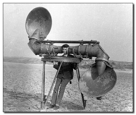Как ни смешно это выглядит, но это действительно большие уши. Этот парень не отдыхает, а слушает небо. По сути дела это огромное подслушивающее устройство. И самое интересное, что это действительно работало. И лучшего способа услышать шум двигателей бомбардировщиков тогда не было. В этой установке нет ничего высокотехнологичного, Вы просто подключаете гигантский конус в ухо и слушаете звук немецких летчиков и самолетов. Элегантно, эффективно и просто. Самой популярной подписью под водобными фото во время Второй мировой, было: «Я только что услышал как кто-то перднул. Скорее всего летчики Геринга уже на пути к нам.»
