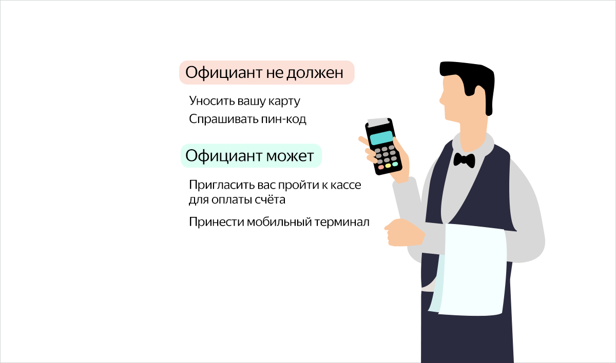 Представьте: вы поужинали в ресторане, официант приносит счёт и уходит с вашей банковской картой к кассе, а вы спокойно допиваете свой коктейль. То, что вы оставили немного напитка, чтобы не сидеть без дела, пока не расплатитесь, — это хорошо. Но с карточкой лучше так не делать. Её вообще не стоит давать никаким третьим лицам для использования без вашего присутствия. Мы не хотим сказать, что если официант унёс карту, то он обязательно мошенник. Но дополнительная бдительность не бывает лишней, когда дело касается личных финансов. Данные карты можно скопировать за считанные секунды. Для этого даже не понадобятся никакие специальные устройства — достаточно переписать номер, срок действия и CVV/CVC карточки. Эту информацию можно использовать, в частности, для оплаты покупок в интернет-магазинах. Да, не все площадки проводят платежи только по этим данным (например, кто-то может запросить пароль 3DS). Да, если магазин всё-таки принял оплату, мошенническую операцию можно попробовать верну