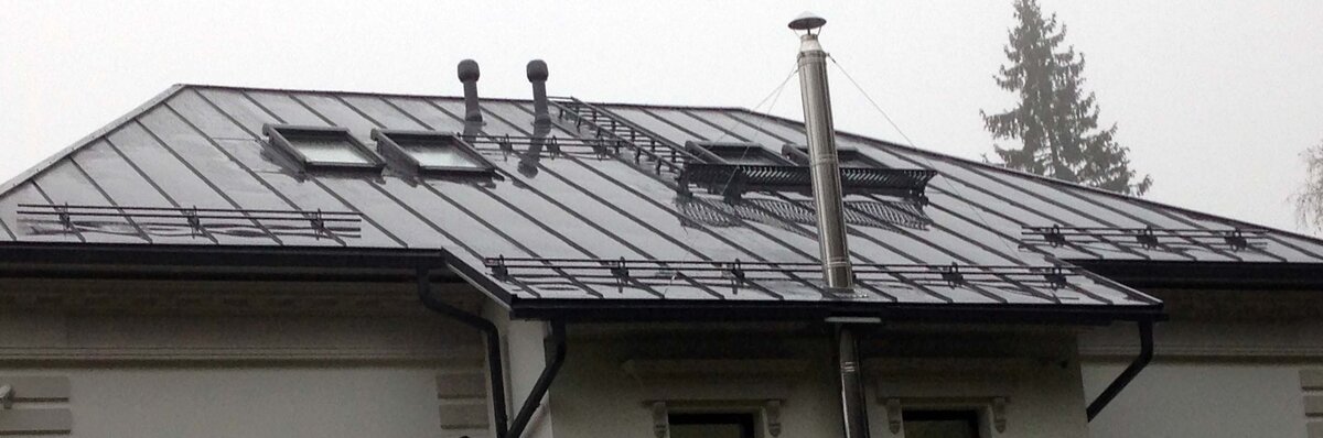 О чем статья: - что обязательно должно быть установлено на крыше? обзор элементов - нужно ли попадать на кровлю? На первый взгляд эта кровля выглядит несколько "перегруженной" разными элементами. Начнем с того, что кровля - это система, которая выполняет ряд важных задач по сохранению комфортной температуры в доме и защите его от воздействия осадков. Во-первых, необходима водосточная система. Если воду не собирать в желоб , то она со временем разбивает отмостку, а цоколь от влаги разрушается и обрастает мхом. Водосток же собирает воду по карнизу, по трубе спускает ее вниз и выводит через систему дреннажа в сток или за пределы участка. Во-вторых, нужны снегозадержатели. Их задача - защита от лавинного схода снега. Также снегозадержатели берут на себя давление снега, оказываемое на водосточную систему, дымоход, элементы вентиляции, мансардные окна. (Про особенности выбора, расчета и правильного монтажа снегозадержателей мы расскажем в отдельной статье). В-третьих, через кровлю, ка