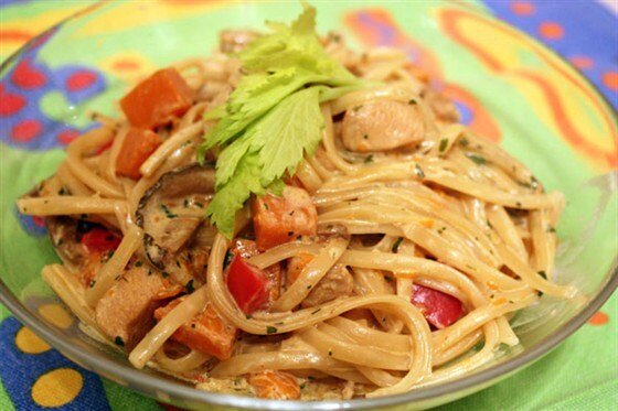 1. Сварить макароны до нормальной готовности. Обжарить лук в масле до золотистой корочки, добавить порезанные кубиками помидоры и курицу. Тушить 5 минут, затем добавить горчичный соус с базиликом.