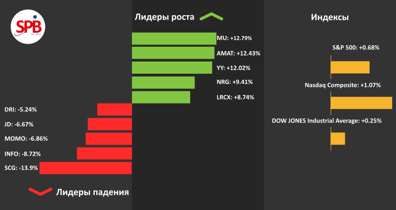 Акции компании Micron Technology, Inc (SPB: MU) прибавили за неделю 12,79%. Финансовый отчет компании оказался лучше ожидания аналитиков. Выручка компании за отчетный период составила $6,188 млрд, прибыль на акцию составила $2,02, аналитики прогнозировали выручку на уровне $5,9 - $6,1 млрд, а прибыль на акцию в районе $1,83 на акцию.