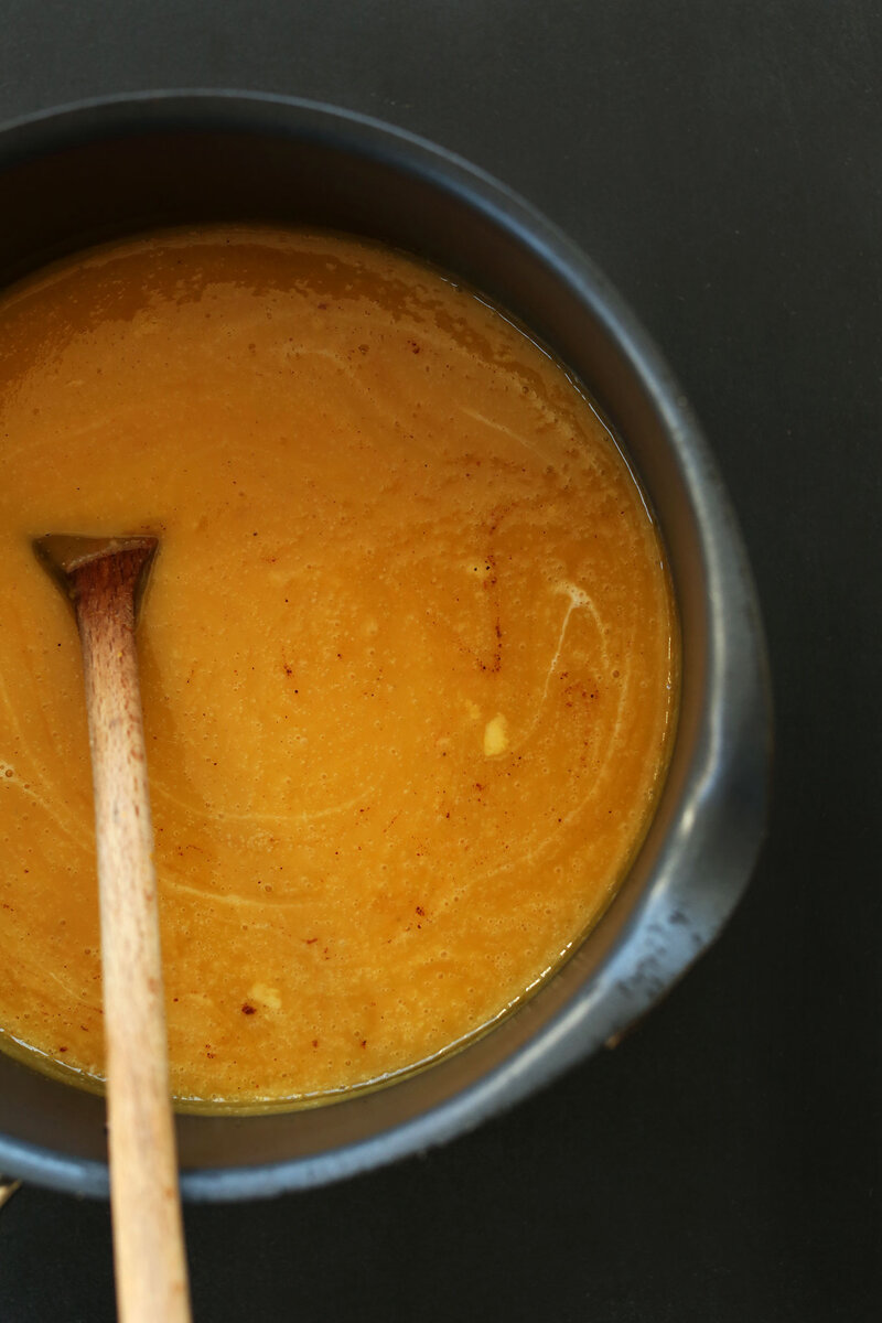 2. В глубоком сотейнике или кастрюле с толстым дном необходимо растопить сливочное масло и обжарить в нём заготовку из овощей. Достаточно будет пяти минут, чтобы тыква и морковь пустили сок и немного размягчились.