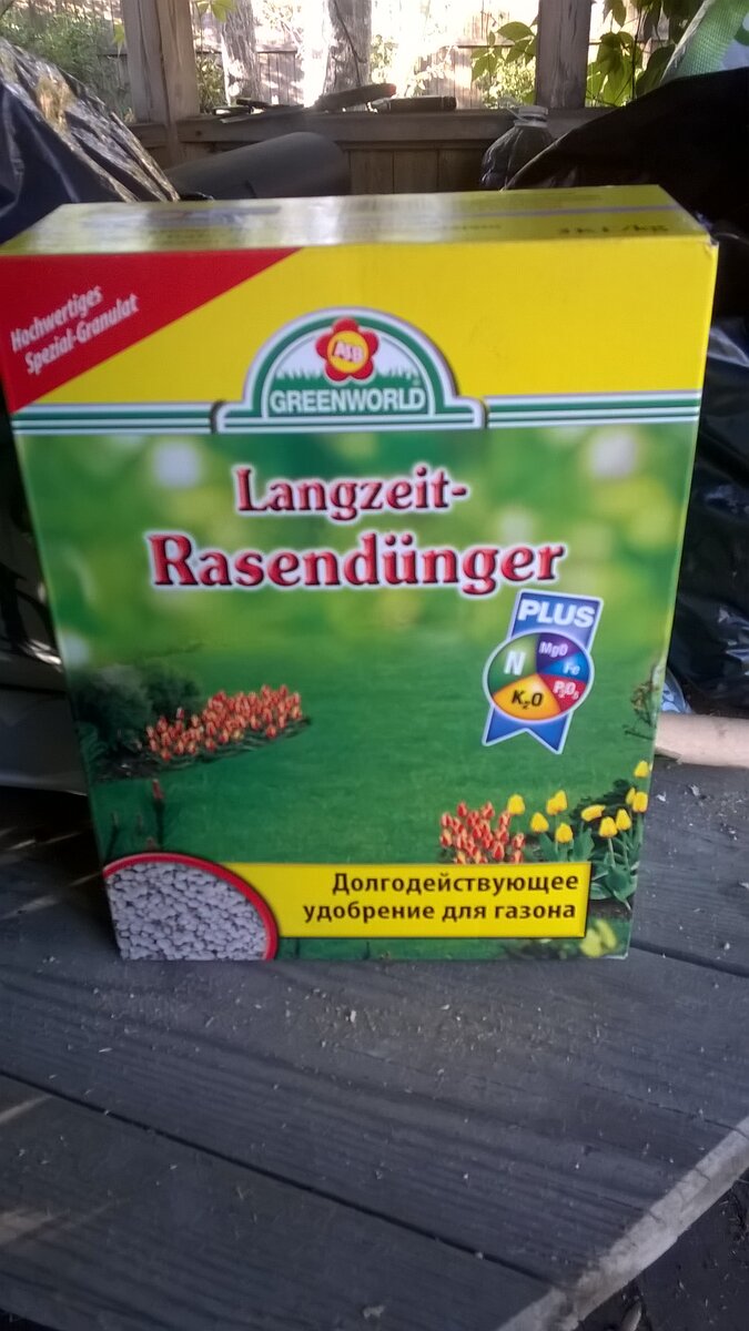 Несмотря на название марки - Green world это немецкое удобрение. Об этом говорят немецкие надписи на коробке. В этой коробочке две интересные вещи. Первая, это то, что фирма ее выпустившая расположена на улице Порше. Фердинанда Порше, если что. Но, для немцев это нормально. Вторая милая особенность этого, что пачка на три килограмма стоит 700 рублей, что ли - точно не помню, но не больше. Если сравнивать с российским неплохим удобрением, то на килограмм получается дороже - 230 рублей против 180, что ли, но использовать немца можно реже. Да и нужно реже. И вот о том, как использовать - несколько отдельных слов. Удобрение в коробке - в виде довольно крупных гранул. Они, как мелкий горох размером. В принципе, удобрение можно использовать при создании газона - тоже очень неплохо, но особенно хорошо, при подкормке газона на зиму. Удобрение реально долгодействующее. Гранулы неспешно растворяются, выпуская питательные вещества в почву. Сыпать его полагается порядка 30 граммов на квадратны
