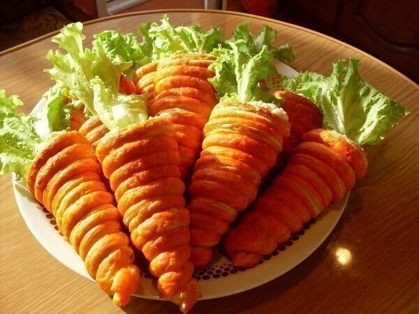 Ингредиенты для трубочек: — 500 г слоёного теста — морковный сок, смешанный с томатной пастой Ингредиенты для салата: — 2 куриные грудки — 2 свежих огурца — 2 яйца — 1 лук репчатый — укроп — майонез — петрушка или листья салата для украшения Приготовление: 1. Раскатайте слоёное тесто и нарежьте его полосками шириной около 1 см. 2. Сверните из плотного картона конусообразную палочку и намотайте на неё полоски теста, сделав «морковки». 3. Положите трубочки из теста на противень, смажьте морковным соком с томатной пастой (также можно взять оранжевый пищевой краситель) и запекайте до готовности в духовке. 4. Приготовьте салат, смешав натёртые на крупной тёрке яйца, огурцы, разобранные на волокна куриные грудки и мелко нарезанный укроп. Посолите, поперчите, смажьте майонезом. 5. Положите салат в полиэтиленовый пакет, проделайте в углу пакета отверстие и начините остывшие трубочки салатом. 6. Вставьте несколько стебельков петрушки или листья салата в трубочки. 7. Можно