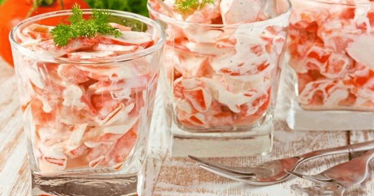 Интернет пестрит рецептами что-то вроде "ужин за 5 минут", "удиви гостей блюдом за 10 минут", никогда этому не верила, все эти "быстрые" блюда отнимают минимум час времени. Но вот я как то наткнулась на рецепт салата, который на самом деле готовится минут за 5-7. Ничего не надо варить, размораживать, настаивать и так далее, просто берешь и режешь. Необходимые продукты: 1. Помидоры-400 г 2. Крабовые палочки-200 г 3. Красный болгарский перец- 1шт 4. Чеснок 3-4 зубчика 5. Твердый сыр-200 г 6. Соль 7. Майонез Способ приготовления очень простой. Помидоры, крабовые палочки и болгарский перец нарезаем соломкой, сыр натираем на крупной терке, чеснок проводим через пресс, соль и майонез добавляем по вкусу. Салат получается очень вкусный. Подходит как на праздничный стол, так и на обычный ужин в кругу семьи. Приятного аппетита!