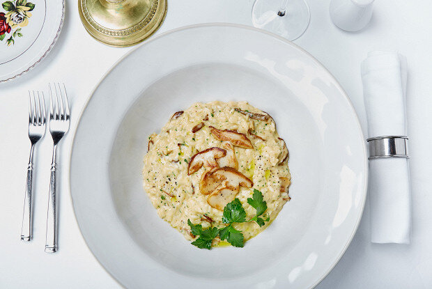 4. Выложить ризотто в тарелку, украсить кусочками белых грибов и петрушкой.