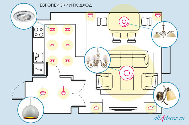 Освещению в интерьере уделяют незаслуженно мало внимания. В то время как это едва ли не главный элемент дизайна. От света зависит, насколько удобно вам будет находиться в пространстве, занимаясь своими делами, как будут видеться цвета и текстуры в доме. Чтение книг, приготовление пищи, поиск старых туфель, поход в ванную, подъем по ночной лестнице – все это становится кошмаром без люстр, бра и торшеров в нужных местах. Поэтому нашу вводную статью мы посвятим базовым советам по организации освещения. Поймите, на какую сторону света «смотрят» ваши окна. Если это Север, то свет в комнате всегда будет тусклым и рассеянным, в помещениях с окнами на Запад темновато в первой половине дня, а — на Восток — во второй. Южная же сторона обеспечит неистощимым запасом солнечных лучей, а значит, теплом и светом, на весь день. Для чего это нужно? Чтобы понять, каким количеством дневного света вы располагаете, и соответственно, сколько нужно источников света искусственного. Так мы познакомились