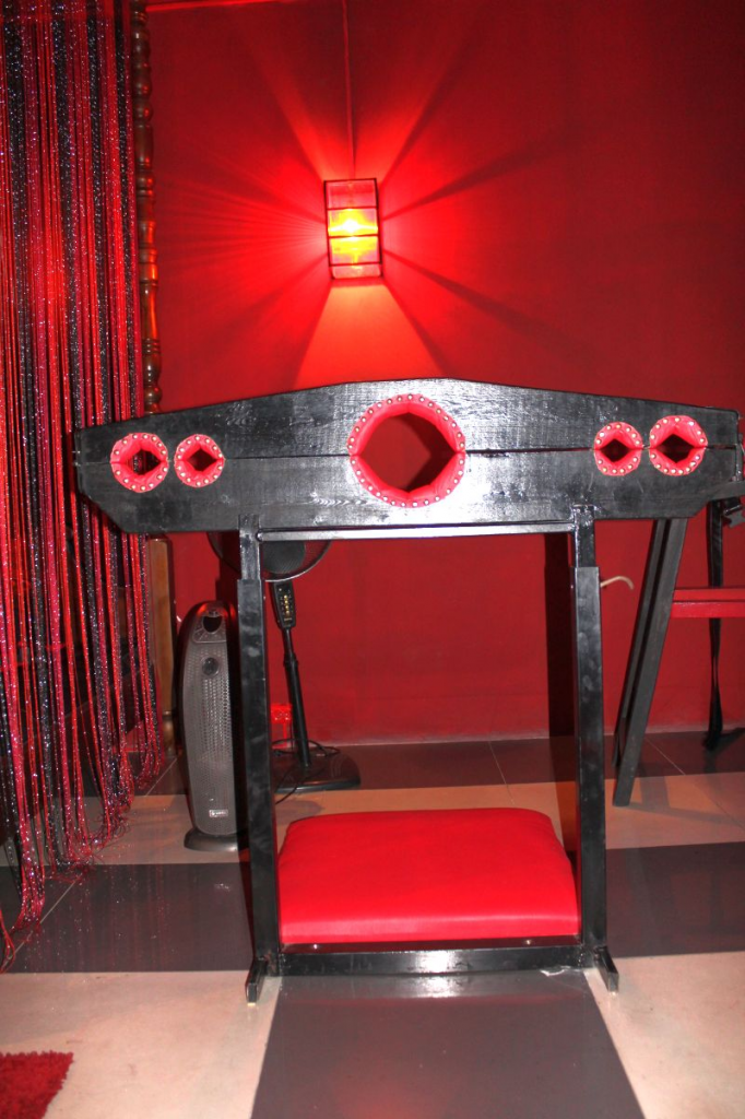 Андреевский крест, позорный столб, скамья для порки, качели для секса. Десятки самых разных кнутов и плеток, как говорится, любого калибра и на любой вкус. Кожаные маски собаки или лошади, намордники, кляпы, наручники и ошейники, недвусмысленные костюмы. Перечислять все, что есть в красной комнате, можно долго. Интересно, что управляющая гостевого дома Юлия досконально знает обо всех сексуальных приспособлениях: что и куда крепится, куда и кто подвешивается или как именно может использоваться та или иная вещь.