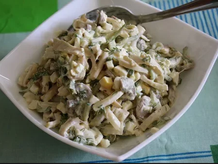 Предлагаем вашему вниманию очень простой в приготовлении салат из кальмаров и маринованных грибов. Время приготовления 15 минут. Ингредиенты 500 гр. кальмаров 300 гр. маринованных шампиньонов 2 маринованных огурца 3 яйца 2 луковицы 1 столовая ложка свежего укропа Соль и черный молотый перец Растительное масло Майонез Приготовление Кальмары размораживаем, промываем, удаляем лишнее и отвариваем в кипящей воде не более минуты, вынимаем, остужаем и нарезаем соломкой. Если шампиньоны целые, то нарезаем пластинками. Лук обжариваем полукольцами на растительном масле. Огурцы нарезаем соломкой, отварные яйца кубиком, укроп мелко рубим. Складываем в миску все ингредиенты, майонез, соль и черный молотый перец, перемешиваем, даем салату охладиться в холодильнике пару часов и подаем к столу. Приятного аппетита!