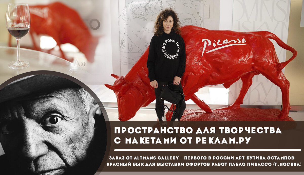 В Altmans Gallery в Москве организована выставка Пабло Пикассо, объединившая уникальные работы из частных коллекций, которые раньше не были недоступные широкой публике. Выставку посетили Юлия Барановская, Катерина Шпица, Анна Чурина и другие звезды. Студия reklam.ru подготовила тематическую фигуру Красного быка Picasso для эксклюзивного оформления экспозиции. Более 5000 человек посетило выставку Пабло Пикассо в первые дни работы. Ростовая фигура красного Быка привлекает внимание абсолютно всех любителей искусства, а социальные сети пополняются интересными снимками.