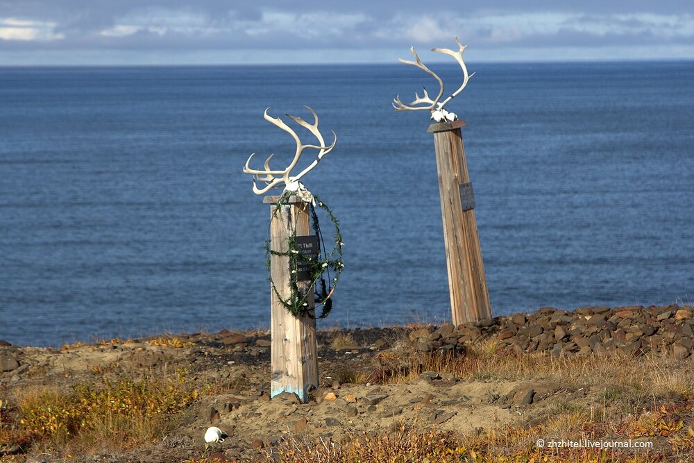 Кладбище на окраине заброшенного чукотского национального поселка Янранай производит сильное впечатление. На высоком продуваемом берегу моря стоят покосившиеся столбики с рогами. Буквально пару лет назад поселок покинули последние жители, теперь памятники на кладбище хранят память не только по умершим когда-то жителям, но и по всему поселку. В Янранае еще несколько лет назад кипела жизнь. Жители ушли не по своей воле, было решено, что поселок содержать невыгодно, поселок расселили. Немногочисленным жителям выделили жилье в Певеке. Сейчас здесь никто не живет. Кладбище находится на окраине поселка. На памятниках можно встретить рога, а около могил лежат чашки или кружки. Как пояснила женщина, которая жила в этом поселке, рога ставили местным, когда-то работавшим в оленеводстве. Чашки, кружки всегда были на могилках, туда наливали либо спиртное, либо чай. Есть могилки с санками. Это дети. По обычаям оставляли то, что умершим пригодится там, в загробной жизни. Но иголки, нитки,