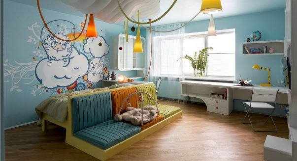 Детская комната с голубыми стенами, отделанная по проекту Константина Русева, выглядит очень оригинально. Смелый декор превращает ее в территорию увлекательных игр и волшебных снов, а разноцветные светильники для детской комнаты не только наполняют светом пространство, но и служат оригинальным украшением. Комната спроектирована для ребенка — это чувствуется и в декоративных элементах, и в продуманной меблировке. Здесь нет места скучному взрослому миру: только радость, только положительные эмоции.