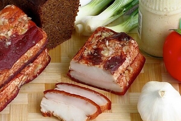 Ингредиенты: свиное сало или грудинка (желательно с мясной прослойкой)- 400-500 г для рассола: вода - 1 литр соль - 1 стакан луковая шелуха (от 7-10 луковиц) чеснок - 5-6 зубчиков лавровый лист - 3-4 шт перец душистый - 4-6 шт Приготовление: Приготовить рассол.