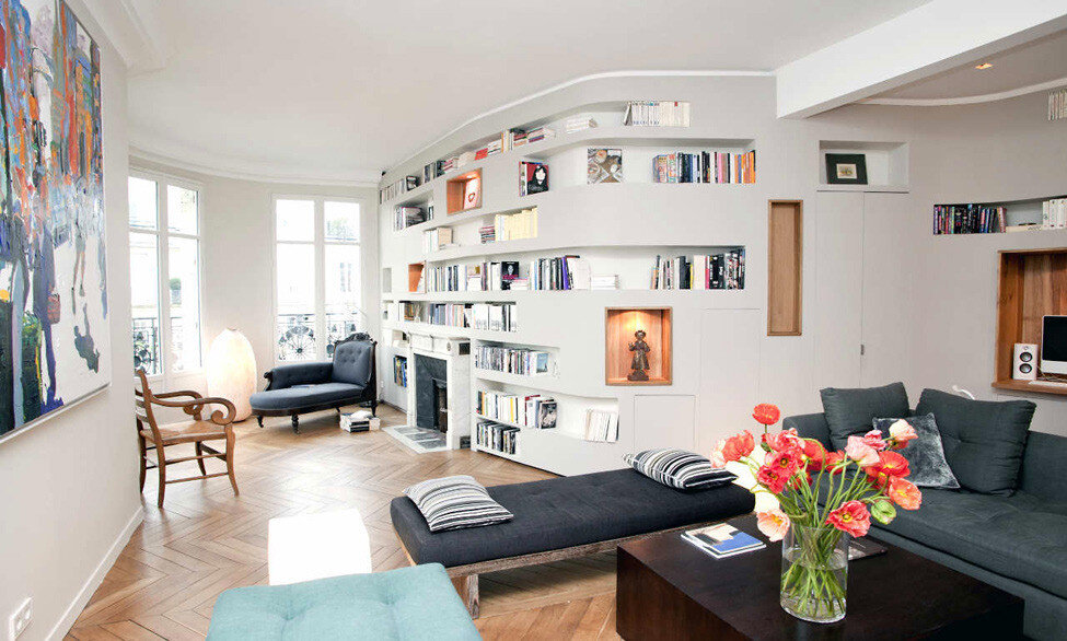 Rimes et Mouvements de Rames — это дизайн-проект жилой квартиры площадью 140 кв.м. в центре 17 административного округа Парижа от дизайнеров компании PPil. Расположенная на 6 этаже здания, построенного еще в конце 19 столетия, квартира подверглась серьезное перепланировке. Благодаря наличию большого количества широких окон, солнечный свет мог свободно проникать в помещения, озаряя их. Однако расположение комнат было не самым удачным и большое количество лишних стен и перегородок было причиной темных углов и ощущения замкнутости. Открытая планировка не только позволила равномерно распределить естественное освещение, но и визуально расширить пространство. Одним из главных элементов дизайна является книжная полка, которая проходит через гостиную, столовую и кухню. Она является своеобразной границей между комнатами, однако, в отличие от простой стены, ее изогнутая форма не давит и не мешает. Смотрите далее: Парижский лофт за €8.9 миллиона Источник