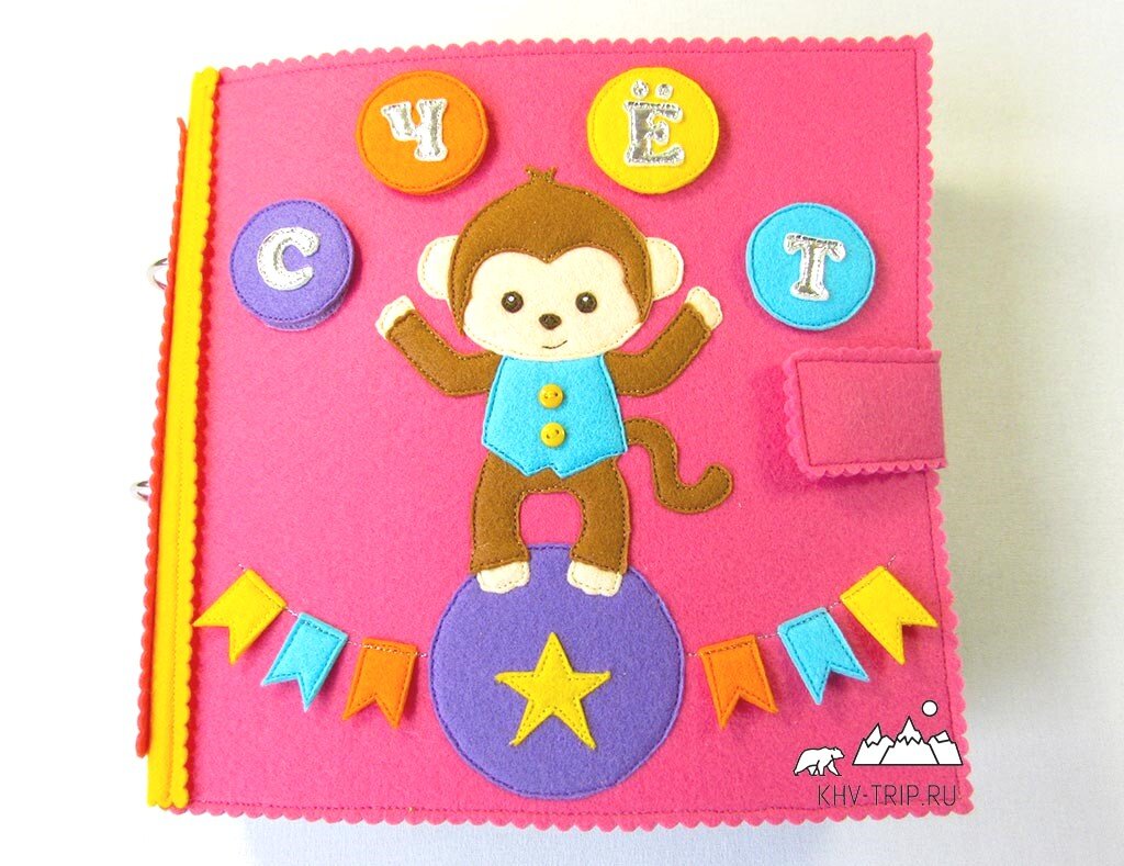 3. На третьей страничке знакомимся с цифрой «три». Сшита эта страница по мотивам одной детской песенки, которую очень любит моя дочка.»Три обезьянки по дереву ходили