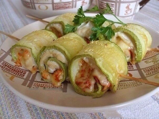 Ингредиенты: -молодые кабачки (или цуккини) - 2 шт.; -филе куриной грудки - 1 шт.; -чеснок - 2 зубчика; -сыр твердый - 50 г; -готовый соус из паприки (не острый); -несколько листиков базилика; -соль, черный молотый перец; -оливковое масло. Приготовление: 1. Кабачки вымыть и нарезать полосками примерно по 0,5 см. 2. Противень застелить бумагой для выпечки, разложить кабачки, немного смазать оливковым маслом и посолить. Поставить в разогретую до 180 градусов духовку на 5-7 минут, чтобы кабачки стали мягче и лучше сворачивались. 3. Куриное филе нарезать тонкими продольными полосками, немного отбить, посолить и поперчить. 4. Добавить чеснок, перемешать и оставить немного помариноваться. 5. На подготовленные кабачки выложить полоски куриного мяса, присыпать сыром, базиликом, добавить немного соуса. 6. Скрутить рулетики из кабачков с куриным мясом, сколоть их шпажками и запечь при 180 градусах 25 минут. 7. Рулетики из кабачка с куриным мясом готовы.