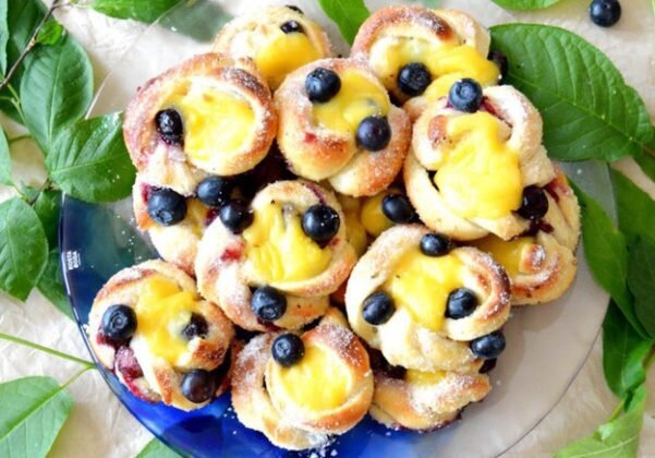 - Затем в центр каждой булочки выложить ванильный крем и выпекать в предварительно разогретой до 200 градусов духовке 10 минут.