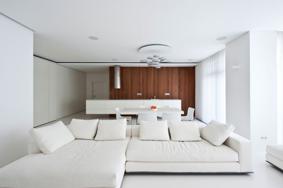 Архитектурное бюро Александры Федоровой работало над оформлением интерьера апартаментов в жилом комплексе Велтон Парк в Москве. Площадь квартиры составляет 120 кв.м. Главной задачей было создание единого пространства, отсутствие коридоров и деления на комнаты. Именно поэтому прихожая является частью кухни, а кухня частью гостиной. Все вспомогательный предметы интерьера замаскированы и не загромождают пространство. Так, консольная кухня является еще и полкой для перчаток, ключей и прочих мелочей, которые хозяева складывают при входе на белый прямоугольник, висящий на деревянном кубе. В этом кубе невидимкой скрываются три двери, ведущие в кабинет, гостевой санузел и вспомогательное помещение. А глазу открывается лишь единое пространство гостиной, и это самое главное. Приватная зоны также расположена за «скрытой дверью», и комнаты там нераздельны, между спальней и ванной нет глухих стен. Стекло отделяющее ванную и гостиную прозрачное, но становится матовым при легком нажатии на «волшебну
