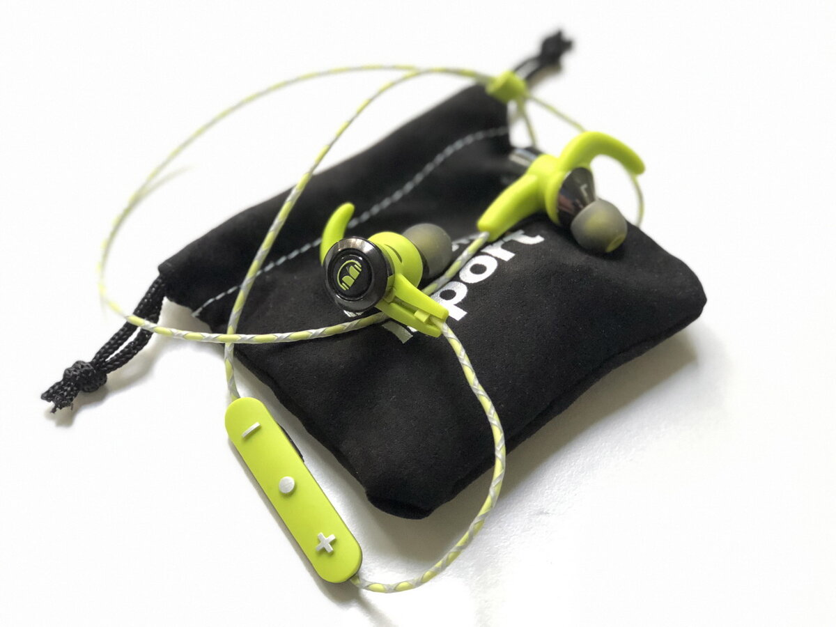 Мне достался экземпляр кислотного желтого цвета, однако для ценителей есть голубые и черные. Корпус вкладышей пластиковый, хотя весьма убедительно притворяется металлическим. Насадки с «рожками» выполняют двойную функцию – обеспечивают дополнительную фиксацию в ушной раковине и защищают кабель от излома на входе в корпус. Последнее очень круто: самая частая причина поломки наушников – порча кабеля на стыке. И если учесть, что спортсмены совершают множество монотонных движений, обычные наушники могут очень быстро дать дуба. Но здесь все сделано по уму. И кабель снабжен в меру мягкой резиновой оплеткой.