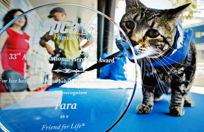 Кошке, которая спасла ребенка от нападения собаки, присвоили медаль «Hero Dog» (Собака-герой) за беспрецедентный героизм, где слово «собака» исправили на «кошка». Такого в истории еще никогда не происходило. Среди домашних животных спасателем и героем обычно выступают собаки – они более привязаны к людям, сильнее и крупнее размером. Но иногда случаются и невероятные вещи, как в этом видео – домашняя кошка героически спасает ребенка от пса. Кошка Тара, ставшая на защиту своего 4-летнего хозяина Джереми, стала настоящим героем. В дополнение к медали прилагается годовой запас корма высшего качества. Источник: http://fit4brain.com/4949