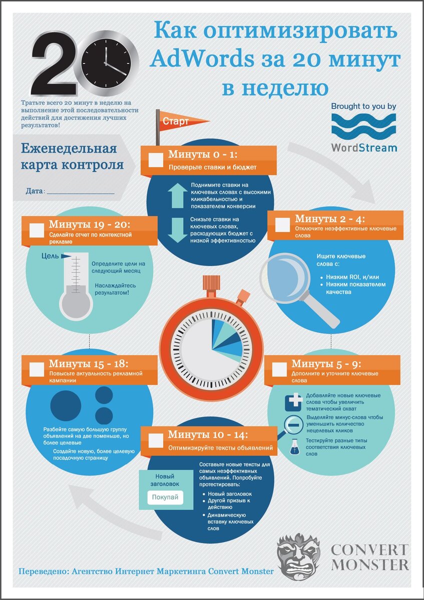 Совсем недавно Word Stream опубликовали в своем блоге прекрасную инфографику, которая просто необходима любому начинающему специалисту по работе с Google Adwords и Яндекс.Директ. В ней описываются 6 простых шагов по оптимизации контекста, которые должен выполнять каждый специалист, который хочет получить результат в рекламе. Сохраняйте к себе на стену и делитесь шпаргалкой с друзьями! Читать еще больше статей в источнике: https://convertmonster.ru/blog