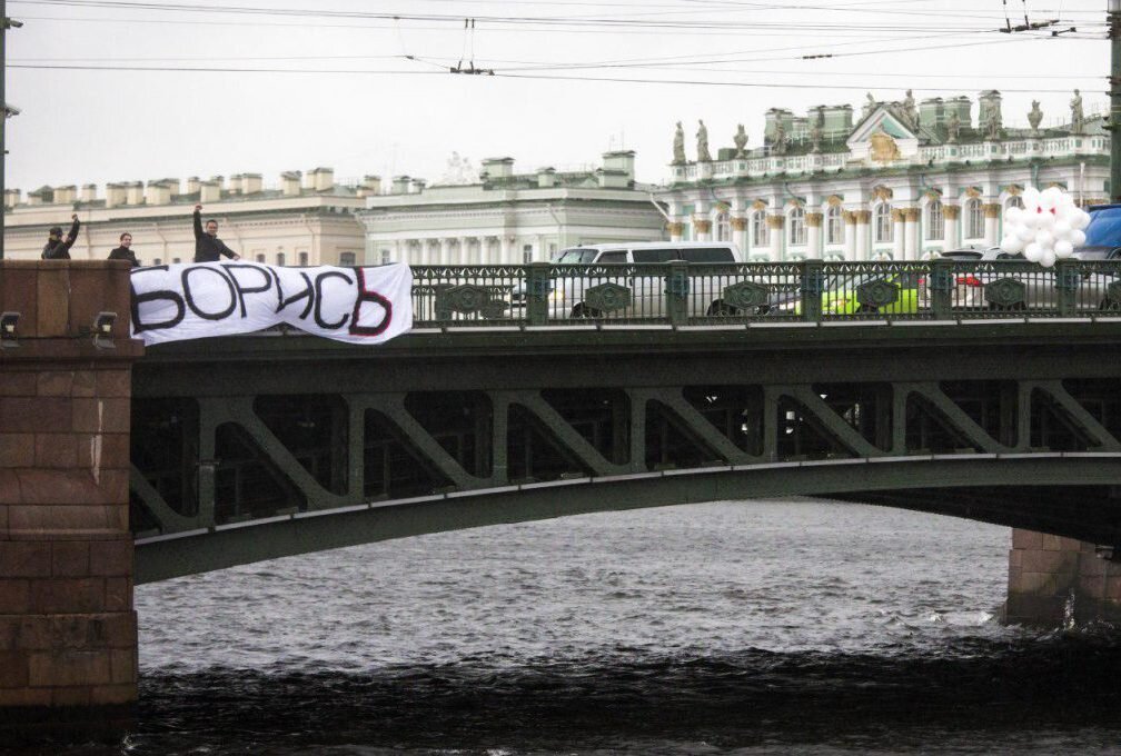 Петербургские активисты 9 октября отметили день рождения Бориса Немцова, вывесив на Дворцовом мосту баннер со словом БОРИСь. Участники акции также запустили в небо 55 белых воздушных шаров и три красных - по числу лет жизни Немцова и лет, прошедших со дня его убийства. О задержании участников акции не сообщается. Напомним, политик Борис Немцов был убит пятью выстрелами поздно вечером 27 февраля 2015 года на Большом Москворецком мосту в Москве. Суд признал виновными в его убийстве пятерых уроженцев Северного Кавказа.